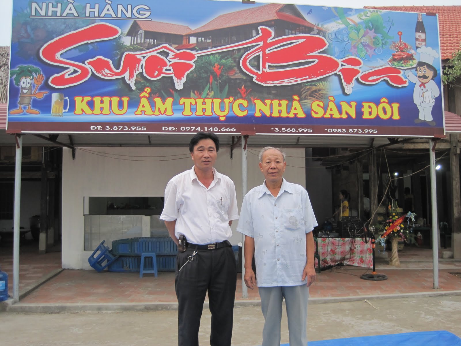 Hôm nay, đi trong không khí tưng bừng chào mừng kỷ niệm Ngày Quốc Khánh Mùng Hai Tháng Chín dọc các đường phố khang trang của trung tâm huyện lỵ Hiệp Hòa (Thị trấn Thắng), trong tôi đã rạo rực niềm vui khi nhìn rõ những thành quả của Cách mạng qua hơn nửa thế kỷ. Đến Nhà hàng Suối Bia của Trần Chi, ở địa điểm mới, giáp ranh giữa Thị trấn Thắng với xã Ngọc Sơn, cảm nhận về thành quả cách mạng trong tôi càng cụ thể hơn. Một nhà hàng với hai nhà sàn cổ hoàn toàn bằng gỗ Nghiến, được mua từ tỉnh Cao Bằng chuyển về, mỗi căn nhà rộng trên 100m2. Một nhà lợp ngói để gia đình ở sàn trên, sàn dưới là quầy bán hàng. Một nhà lợp lá cọ làm phòng ăn cho khách vừa mát mẻ, vừa sang trọng. Đi liền với hai nhà sàn còn có các phòng ăn có điều hòa nhiệt độ. Phòng nhỏ, mỗi phòng có 3 bàn ăn, 18 ghế ngồi. Phòng lớn có 12 bàn ăn, 72 ghế ngồi, phục vụ theo nhu cầu của khách. Một nhà hàng mang tên “Khu ẩm thực nhà sàn đôi” vừa cổ kính, vừa hiện đại nhằm phục vụ cho nhu cầu phát triển của cuộc sống đang đổi thay hàng ngày. Theo giới thiệu của Trần Chi, nhà hàng còn phát triển với khu vườn cây cảnh, bể cá, hội trường phục vụ đám cưới và những hạng mục dịch vụ khác. Quản lý điều hành nhà hàng là con trai thứ hai của Trần Chi đã tốt nghiệp Đại học, về làm tại nhà. Tương lai con gái út học xong Đại học cũng về làm tại nhà, không lo “thất nghiệp”. Nhà hàng hiện mới có 15 nhân viên phục vụ.