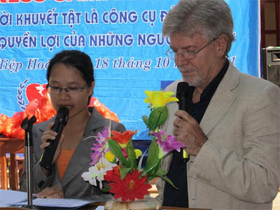Ông Nguyễn Lũy, ông ManLio,bá Nguyễn Thị Bắc điều phối viên dự án thăm hỏi các gia đình và các cháu khuyết tất trong giờ vui chơi.