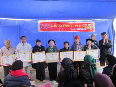 Đã thành nền nếp hàng năm, sáng mùng 4 tết, các cụ làng Thường Thượng (xã Thường Thắng) tổ chức lễ mừng thọ các cụ ông, cụ bà có tuổi 70, 75, 80, 85, 90, 95, 100. Với thế hệ trẻ thì thời tiết mấy ngày tết thật là đẹp. Trời tuy rét nhưng không mưa. Đi chơi tết tha hồ mặc đẹp. Nhưng với các cụ cao tuổi, trời rét quả là ngại ngùng, chẳng muốn ra khỏi nhà. Do đó mà lễ mừng thọ nặm nay các cụ cao tuổi vắng nhiều. Tuổi 85 có 6 cụ thì vắng 4. Tuôit 80 có 7 cụ thì vắng 3. Tuổi 75 có 6 cụ, vắng 3. Tuổi 70 có 10 cụ, cũng vắng 2 cụ. Làng năm nay chỉ có 4 độ tuổi được mừng thọ. Không có các cụ ở tuổi 90, 95, 100. Năm nay có cái mới là các cụ được mừng thọ đều có quà của UBND tỉnh. Tuổi 70, 75 có quà 100.000đ; tuổi 80, 85 có quà 200.000đ; tuổi 90,95 có quà 400.000đ; tuổi 100 có quà 500.000đ. Hội làng có quà cho các cụ tuổi 70, 80 là 1kg đường và 1 hộp bánh; tuổi 75, 85 thì có một hộp bánh. Trước khi vào lê mừng thọ là chương trình văn nghệ, đọc thơ, ngâm thơ mừng thọ, mừng xuân do các cụ tự sáng tác và trình bày.