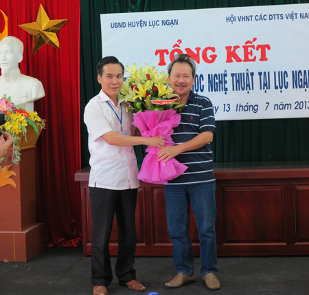 Đồng chí Trần Quang Tấn, Phó Bí thư, Chủ tịch UBND huyện Lục Ngạn (ảnh bìa trái) tặng hoa chúc Hội VHNT CDTTSVN trong lễ tổng kết.