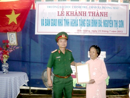 Bà Nguyễn Thị Sơn là em gái và hiện vẫn đang thờ cúng hai liệt sĩ Nguyễn Đắc Yến và Nguyễn Đắc Tuế, hy sinh trong cuộc kháng chiến chống Mỹ cứu nước. Do tuổi cao sức yếu nên đời sống gia đình bà gặp nhiều khó khăn. Được sự quan tâm giúp đỡ về tiền của và ngày công lao động của Trường Đại học Chính trị và các ban ngành đoàn thể địa phương, gia đình bà Sơn được hỗ trợ xây dựng ngôi nhà tình nghĩa với trị giá hơn 160 triệu đồng. Trong đó nhà trường hỗ trợ 60 triệu đồng còn lại là kinh phí của gia đình. Sau hơn hai tháng thi công ngôi nhà đã hoàn thành.