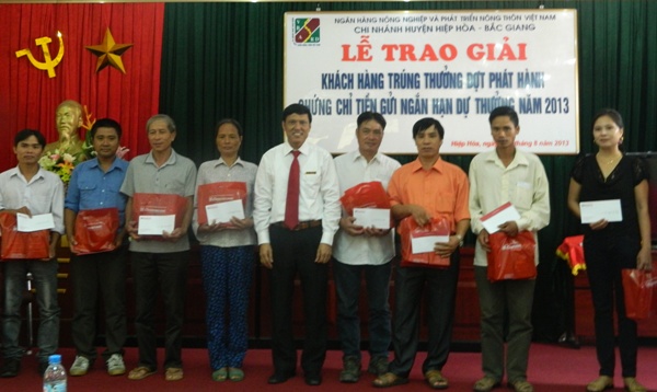 Sáng ngày 23/8, Ngân hàng nông nghiệp và PTNT huyện Hiệp Hòa tổ chức lễ trao giải thưởng cho các khách hàng may mắn trúng thưởng đợt phát hành chứng chỉ tiền gửi ngắn hạn năm 2013.
