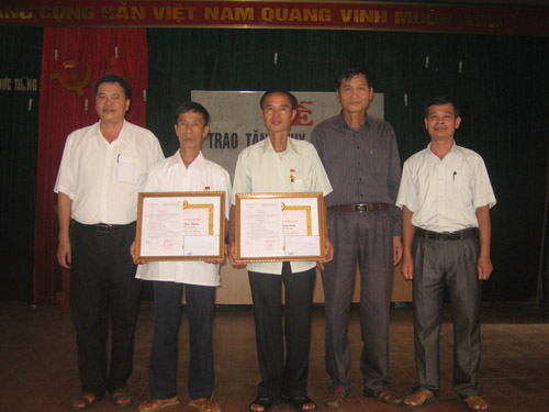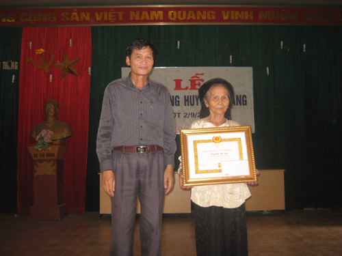 Đồng chí Bí thư Đảng ủy xã trao Huy hiệu 50 năm tuổi Đảng cho đồng chí Nguyễn Thị Lùn
