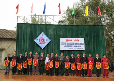 Đồng chí Nguyễn Thế Chính, Tỉnh uỷ viên, Giám đốc Sở VH-TT và DL tỉnh Bắc Giang trao cờ lưu niệm cho các đơn vị tham gia giao lưu hát dân ca các CLB tại xã Kiên Lao.
