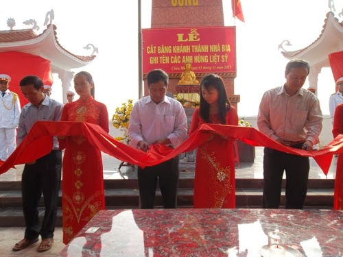 Các đồng chí lãnh đạo địa phương và các đại biểu cắt băng khánh thành nhà bia.