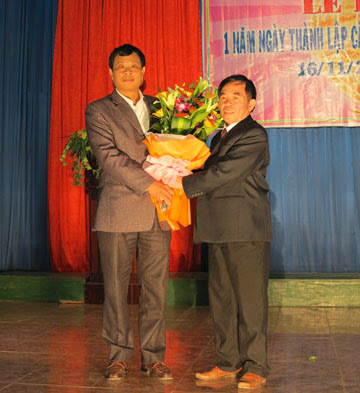 Bà Trần Thị Minh Sử, Trưởng phòng, Phòng Văn hoá-Thông tin Lục Ngạn tặng hoa chúc mừng.