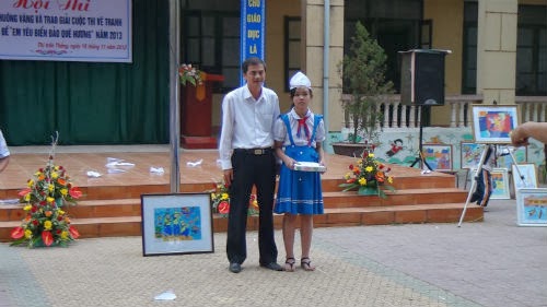 Thầy Nguyễn Trường Sơn- Phó phòng GD- ĐT trao giải Nhất cho em Vũ Thị Thùy Trang