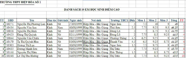 Danh sách 10 học sinh đạt điểm cao nhất trong kỳ thi tuyển sinh vào lớp 10 trường THPT Hiệp Hòa số 1, năm học 2014 -2015. Theo đó, dẫn đầu là em Nguyễn Thị Phương Lan, học sinh trường THCS Ngọc Sơn. Các trường có 2 học sinh trong danh sách này là Ngọc Sơn, Đông Lỗ, Thị trấn.
