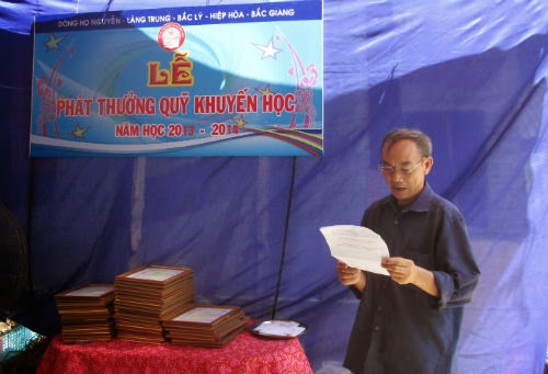 Ông Nguyễn Văn Ngọ, chủ tịch Hội đồng gia tộc đã đọc báo cáo về công tác khuyến học của dòng họ trong năm vừa qua. Bản báo cáo đã nêu rõ: dòng họ Nguyễn – Làng Trung xã Bắc Lý có 69 hộ với gần 400 nhân khẩu. Trải qua 13 đời nối tiếp, dòng họ ngày càng phát triển và có nhiều đóng góp tích cực trong công cuộc xây dựng và bảo về quê hương. Hiện tại, dòng họ có gần 50 thành viên có trình độ đại học, cao đẳng, trong đó có 1 tiến sĩ 3 thạc sĩ và gần 50 cháu đang theo học ở các trường phổ thông và đại học cao đẳng. Theo thống kê, trong 3 năm liên tiếp, số lượng các cháu được khen thưởng ngày càng tăng. Nếu như năm 2012 mới có 19 cháu thì năm 2013 có 26 cháu và đến năm nay đã có 38 cháu được dòng họ tuyên dương khen thưởng. Tiêu biểu trong những gương mặt được khen thưởng hôm nay có cháu Nguyễn Huy Hoàng – đỗ Đại học năm 2013, cháu Nguyễn Phan Tường Vân – đạt giải Ba trong cuộc thi FSTIVAL PIANO CEG 2014 và 11 cháu đạt danh hiệu HSG trong năm học vừa qua.