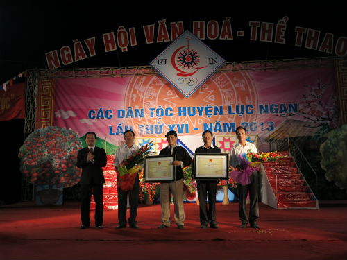 Phó chủ tịch UBND tỉnh Bắc Giang Lại Thanh Sơn trao chứng nhận di sản văn hoá phi vật thể cấp Quốc gia cho dân ca Sán Chí (xã Kiên Lao) và dân ca Cao Lan (xã Đèo Gia) tại Ngày hội Văn hoá – Thể thao các dân tộc Lục Ngạn 2013.