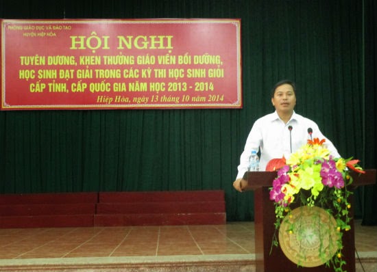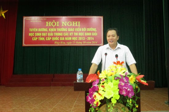Sáng nay, 13-10, tại Nhà văn hóa huyện Hiệp Hòa, Phòng giáo dục- đào tạo đã long trọng tổ chức Hội nghị tuyên dương, khen thưởng giáo viên bồi dưỡng, học sinh đạt giải trong các kỳ thi học sinh giỏi cấp tỉnh, cấp quốc gia- năm học 2013-2014. Tới dự có đ/c Vũ Chí Kỳ- Phó bí thư huyện ủy, Chủ tịch HĐND, Chủ tịch Hội khuyến học Hiệp Hòa, đồng chí Tạ Việt Hùng, Phó chủ tịch UBND huyện, đ/c đại tá Nguyễn Song Hiền, Chính ủy Lữ đoàn 675, Tiến sĩ Hoàng Đăng Huyến, Chi cục trưởng Chi cục Thú y Tỉnh Bắc Giang và đại diện lãnh đạo của các ban ngành có liên quan trong huyện cùng đông đủ các thầy giáo, cô giáo làm công tác bồi dưỡng, các em học sinh đạt giải trong các kỳ thi HSG năm học 2013-2014.