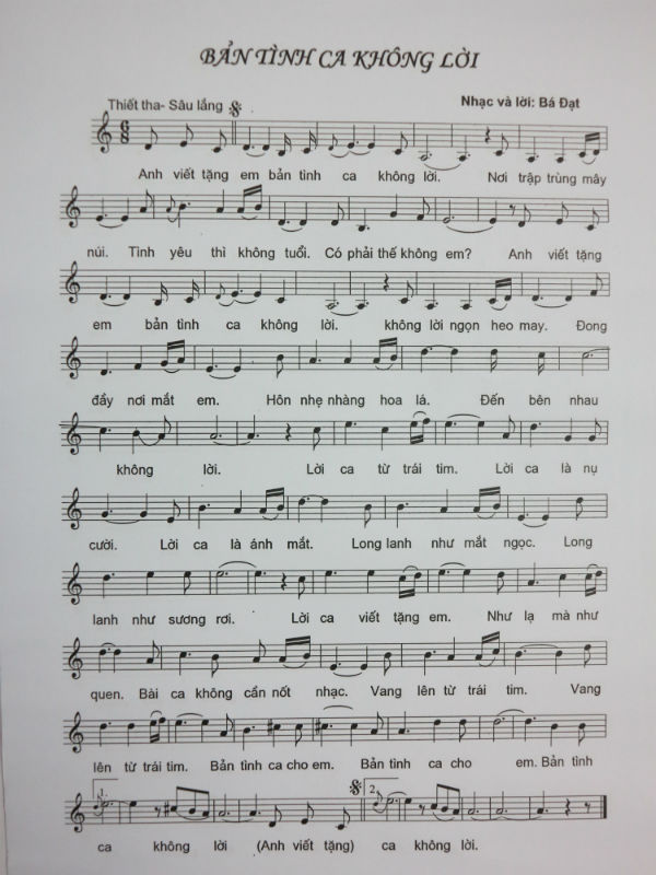 Nhạc sỹ Nguyễn Bá Đạt gửi tặng bạn đọc của Hiephoa.net ca khúc ”Bản tình ca không lời”. BBT trân trọng giới thiệu ca khúc này với bạn đọc và chân thanh cảm ơn nhạc sỹ Bá Đạt.