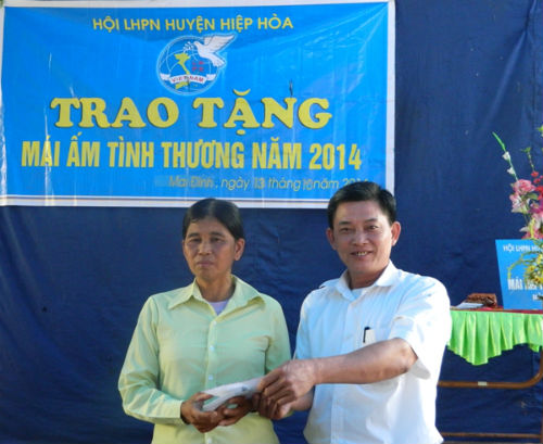 Chị Nguyễn Thị Nhàn là hội viên phụ nữ nghèo, đơn thân không có nhà ở, không ruộng đất. Một mình chị lênh đênh trên chiếc thuyền nhỏ kiếm sống. Trước nhu cầu bức thiết về nhà ở của chị Nhàn, em trai chị đã mua cho chị 50m2 đất giáp bờ sông để chị làm nhà. Cùng với đó, Hội LHPN huyện Hiệp Hòa đã quyết định hỗ trợ kinh phí giúp đỡ chị Nhàn xây dựng nhà ở. Ngôi nhà ấm áp nghĩa tình được xây dựng trên diện tích 25m2, tổng kinh phí 50 triệu đồng. Trong đó, Hội phụ nữ huyện hỗ trợ 20 triệu đồng từ “Quỹ mái ấm tình thương cho phụ nữ và trẻ em nghèo” của huyện, Ngoài ra, bản thân chị Nhàn và anh em trong dòng họ giúp đỡ 28 triệu đồng, Hội Phụ nữ xã ủng hộ hơn 2 triệu đồng, Chị em phụ nữ trong thôn ủng hộ hơn 20 ngày công lao động. Ngoài ra, trong ngày trao tặng mái ấm tình thương cho chị Nguyễn Thị Nhàn, các ban ngành, đoàn thể của xã Mai Đình và thôn Mai Thượng cũng đã tặng gia đình chị Nhàn một số đồ dùng cần thiết để gia đình ổn định cuộc sống trên bờ.