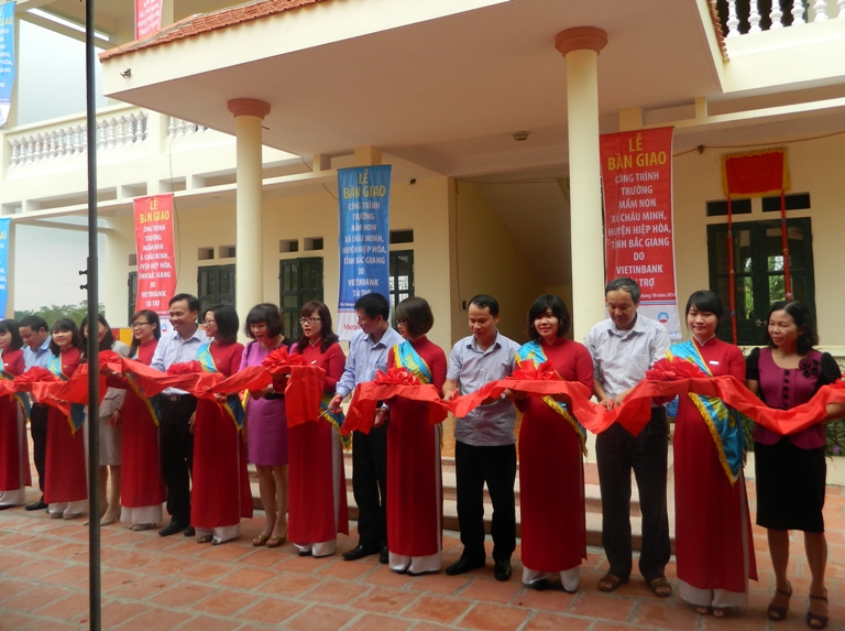 Công trình gồm 4 phòng học kiên cố, với tổng mức đầu tư hơn 1,75 tỷ đồng, trong đó Viettinbank Việt Nam tài trợ hơn 800 triệu đồng; UBND huyện Hiệp Hòa hỗ trợ 400 triệu đồng, còn lại là ngân sách địa phương. Công trình khởi công từ tháng 12 năm 2013 và hoàn thành, đưa vào sử dụng đúng tiến độ, khắc phục tình trạng học tạm, học nhờ cho học sinh bậc học mầm non của xã Châu Minh. Tại buổi lễ, đại diện ViettinBank đã bàn giao số tiền tài trợ hơn 800 triệu đồng và trao tặng nhà trường một số đồ dùng học tập, vui chơi cho trẻ, phục vụ trực tiếp việc học tập, giảng dạy của thầy và trò tại đây, với tổng trị giá 75 triệu đồng. Tại đây, bà Nguyễn Thị Thanh Xuân, phó chủ tịch thường trực Công đoàn ViettinBank đã chia sẻ: Đây là việc làm thể hiện tình cảm, trách nhiệm của tập thể cán bộ, nhân viên ViettinBank đối với sự phát triển của cộng đồng, xã hội. Việc làm đó góp phần nâng cao cơ sở vật chất cho ngành giáo dục của tỉnh, trong đó có ngành giáo dục ở xã Châu Minh còn gặp nhiều khó khăn và thiết thực chăm sóc những mầm non của đất nước.