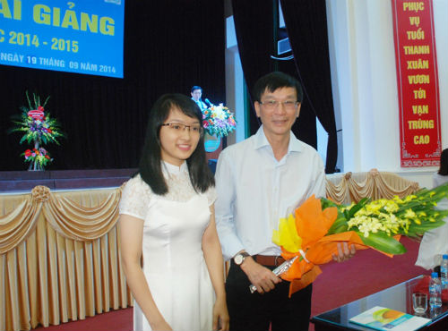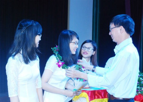 GS Hiệu trưởng trao vòng nguyệt quế cho các thủ khoa QH.2014.F1- Đặng Minh Tâm đứng giữa