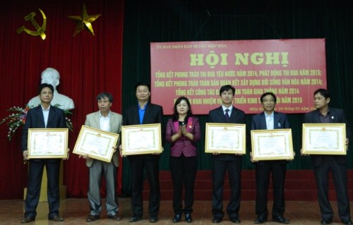 Nhân dịp tổng kết, UBND huyện Hiệp Hòa đã khen thưởng 46 tập thể, 85 cá nhân có thành tích xuất sắc trong phong trào thi đua yêu nước năm 2014; 5 tập thể, 8 cá nhân có thành tích xuất sắc trong công tác đảm bảo trật tự ATGT năm 2014; công nhận 28 thôn đạt danh hiệu văn hóa cấp huyện 2 năm 2013- 2014; công nhận 159 thôn, khu phố, 3 xã, thị trấn đạt chuẩn văn hóa nông thôn mới, thị trấn Thắng đạt chuẩn văn minh đô thị năm 2014; công nhận 33 cơ quan, 80 đơn vị, 3 doanh nghiệp đạt chuẩn văn hóa 2 năm 2013- 2014; công nhận 14 cơ quan, 27 đơn vị, 8 doanh nghiệp đạt chuẩn văn hóa năm 2014.