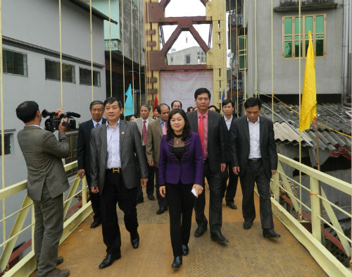 Niềm vui của các đồng chí lãnh đạo và nhân dân trước việc cầu treo Hà Châu đưa vào sử dụng.