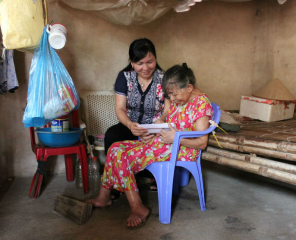 Về đến đầu làng, chúng tôi đã được đoàn cán bộ của xã, của thôn đưa về nhà bà Biên, xóm Róc. Bước vào nhà, tôi hơi sững người trước hình ảnh một người phụ nữ gày guộc, xanh xao, còm cõi, ngồi trên chiếc ghế nhựa đã cột chặt vào thành giường cho khỏi ngã. Hỏi chuyện bà được biết : năm nay bà 69 tuổi. Tật nguyền, côi cút từ thuở ấu thơ. Lớn lên, bà toàn đi giúp việc cho những nhà trên phố. Làm được việc gì thì làm, còn chủ yếu là trông nom con trẻ. Về già, không ai thuê mướn nữa, bà trở về quê, ở với người em con chú. Bà cũng có một người em gái nhưng lấy chồng ở làng bên, dăm bảy ngày mới lên tắm rửa cho bà. Thời gian này, bà Biên mắc chứng bệnh viêm đa khớp. Chân tay phù thũng, toàn thân đau nhức đến nỗi tê dại và không thể nào nằm xuống được. Bà bảo, nằm xuống là không dạy được. Vì thế, mấy tháng nay, chỉ có ngủ ngồi. Và cũng vì ngủ ngồi, nên nhiều khi bị ngã. Các cháu lo lắng, đã giúp bà cột chặt cái ghế vào giường, khoét luôn mặt ghế, đặt bô ở dưới để bà đi vệ sinh cho tiện. Và hình như là bà khổ đã quen rồi hay sao mà khi nói chuyện với tôi, bà không hề than vãn. Kể về ốm đau bệnh tật, thiếu thốn đủ bề…nhưng bà vẫn thản nhiên, cứ như là mặc nhiên phải vậy. Nhất là lúc, mọi người nhấc bà và ghế ra sân chụp ảnh, ai cũng hoảng khi thấy một đám kiến đang bu đầy ngón chân cái của bà. Đuổi hết chúng đi rồi, hỏi bà có đau không? Bà bảo: chân tê dại rồi, chả thấy đau gì cả. Bà hơi nhếch mép mỉm cười. Đây không phải là lần đầu tôi bắt gặp nụ cười của con người tật nguyền và cô đơn đó. Lúc trước , khi chị Hoa trao quà và nhất là khi nghe hỏi : bà còn cần gì nữa? Lúc ấy, bà nói rành rọt lắm: cần một cái xe lăn để tự đi đến chỗ này chỗ khác trong nhà ! Nói xong cả bà và chị Hoa đều cười.
