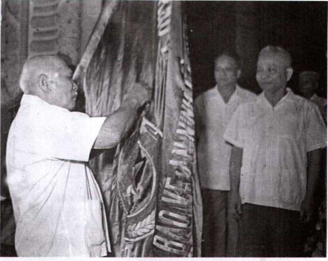 Chủ tịch nước Tôn Đức Thắng gắn Huân chương Hồ Chí Minh lêncờ truyền thống của lực lượng CAND, ngày 19-8-1975.
