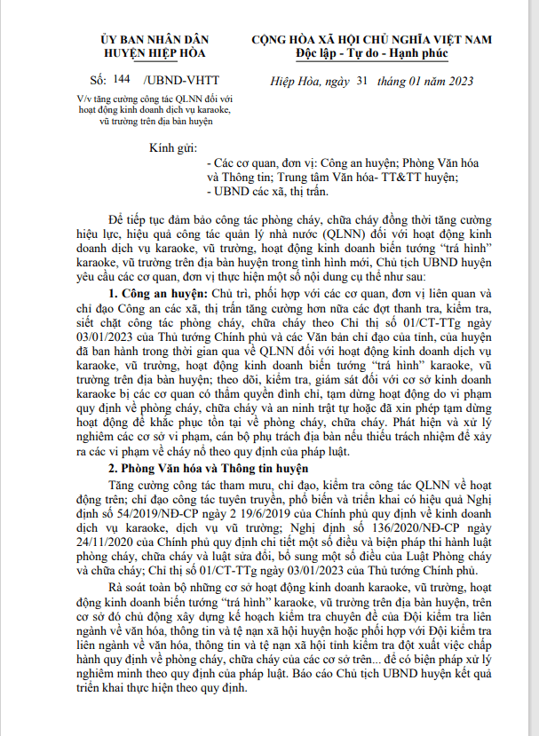 Nhằm tăng cường công tác quản lý Nhà nước đối với hoạt động kinh doanh dịch vụ Karaoke, vũ trường trên địa bàn huyện- Chủ tịch UBND huyệncó công văn số 144/UBND-VHTT ngày 31/01/2023 về việc tăng cường công tác quản lý Nhà nước đối với hoạt động kinh doanh dịch vụ Karaoke, vũ trường trên địa bàn huyện