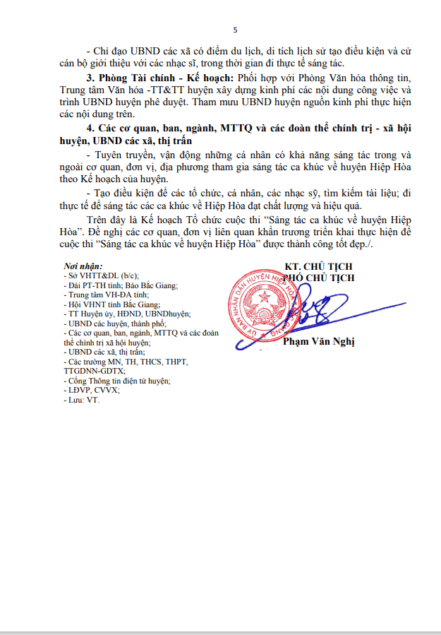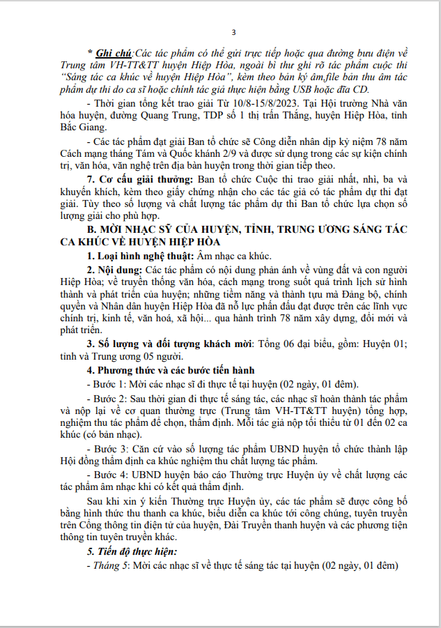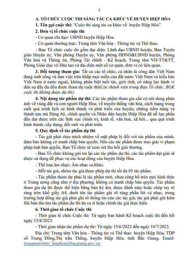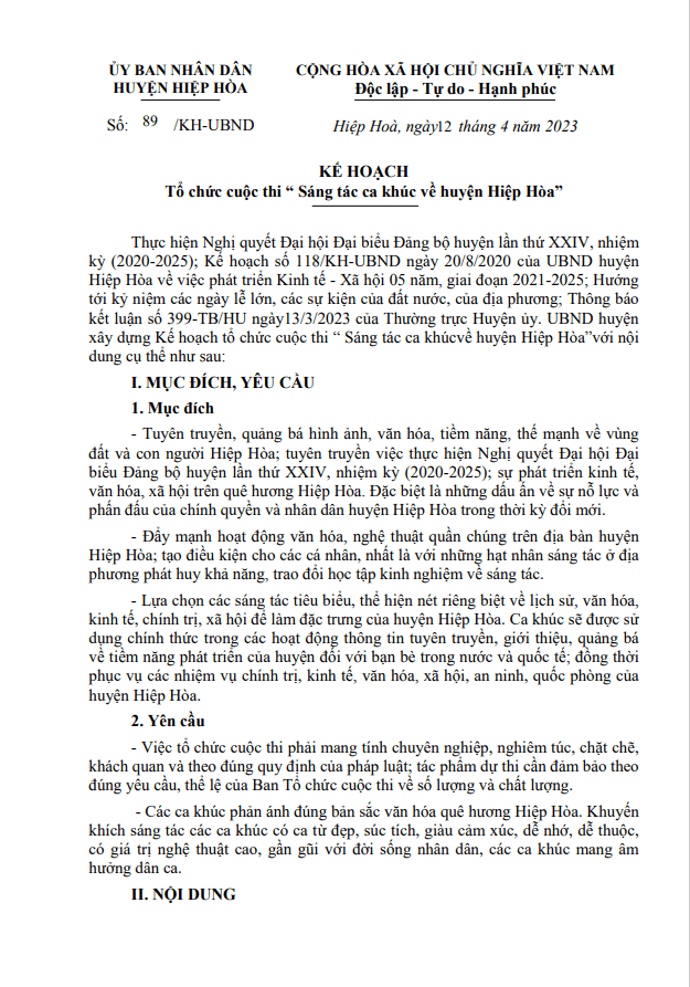 Kế hoạch: Tổ chức cuộc thi “Sáng tác ca khúc về huyện Hiệp Hoà”