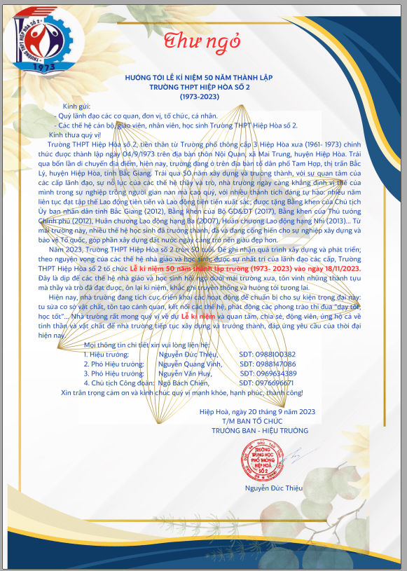 Lễ kỷ niệm 50 năm thành lập trường THPT Hiệp Hoà số 2 ( 1973-2023) sẽ được trang trọng tổ chức vào ngày 18/11/2023 Ban biên tập Hiephoanet.vn đăng toàn văn thư ngỏ của nhà trường tới bạn đọc. BBT