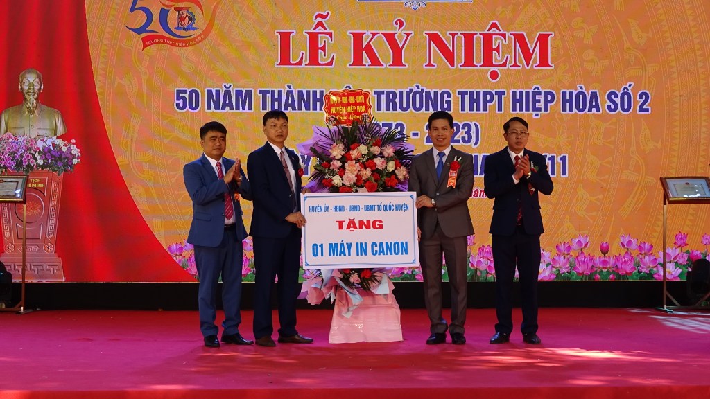 Theo đó, tại buổi lễ kỷ niệm các đại biểu được xem những tiết mục văn nghệ đặc sắc do đội văn nghệ của trường biểu diễn…Sau các nghi lễ chào cờ, diễn văn khai mạc các đại biểu được xem Video rất ấn tượng “ Trường THPT Hiệp Hoà số 2- 50 năm xây dựng và trưởng thành”…