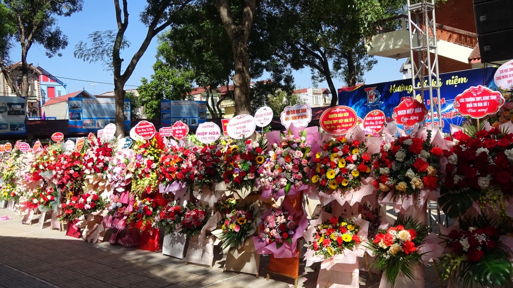 Lẵng hoa chúc mừng của đại biểu và các khoá cựu học sinh