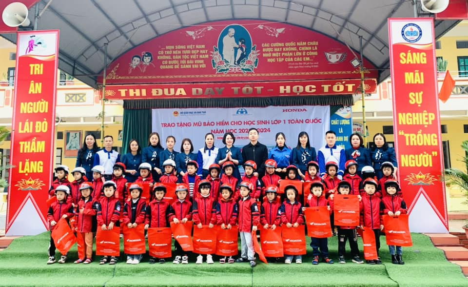 Cuối chương trình, HEAD Honda Đông Ngàn đã tổ chức trao tặng mũ bảo hiểm cho hơn 200 em học sinh lớp 1 của trường.