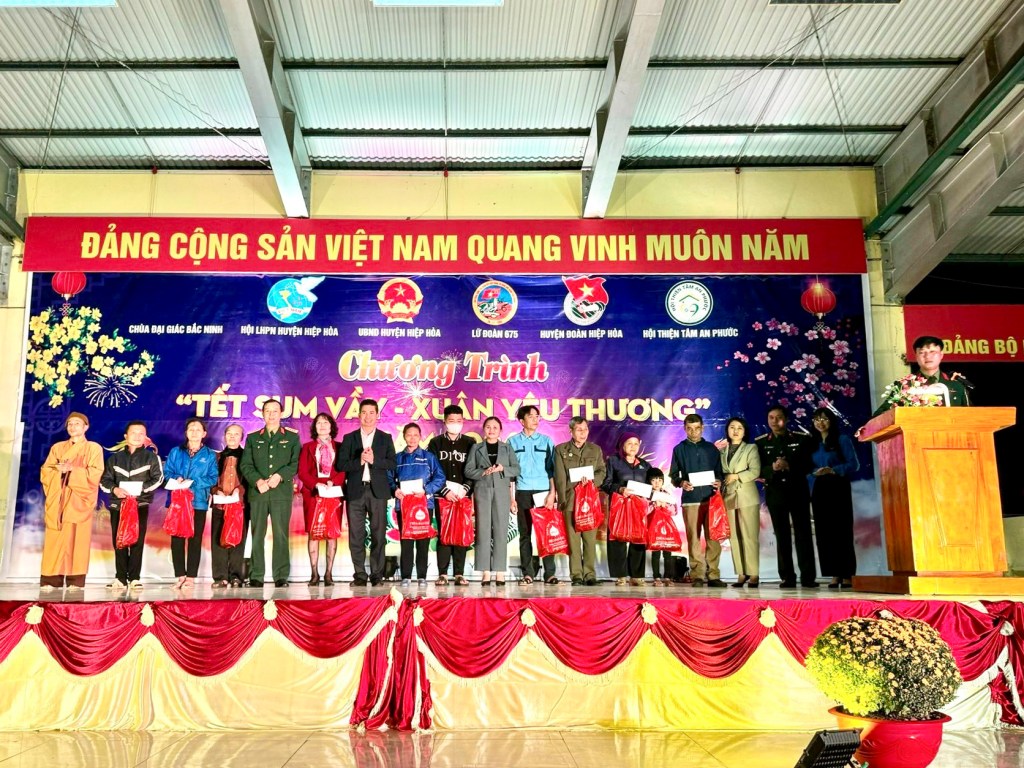 Nhằm tiếp tục triển khai các hoạt động trong Chương trình Tình nguyện mùa Đông 2023 và Xuân Tình nguyện năm 2024; với tinh thần nhà nhà ai ai cũng có một cái tết sum vầy, đầm ấm. Ngày 02/02/2024, Huyện đoàn Hiệp Hoà phối hợp với UBND huyện, Hội LHPN huyện, Lữ đoàn pháo binh 675, Hội thiện tâm An Phước, Chùa Đại Giác (Bắc Ninh) tổ chức chương trình “Tết Sum Vầy, Xuân Yêu Thương” tại Lữ đoàn pháo binh 675.