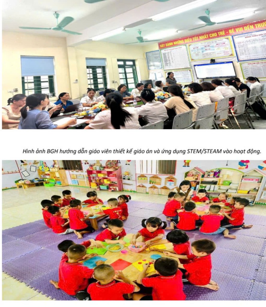 Để hiện thực hóa chủ đề năm học “Đổi mới sáng tạo, đoàn kết kỷ cương, nâng cao chất lượng trường mầm non lấy trẻ làm trung tâm” ngay sau khi Phòng GD tổ chức bồi dưỡng cho các cơ sở giáo dục mầm non, BGH nhà trường đã chủ động tổ chức các buổi bồi dưỡng, tập huấn nâng cao chất lượng chăm sóc giáo dục trẻ, đặc biệt là hướng dẫn áp dụng phương pháp giáo dục STEM/STEAM. Qua đó giúp giáo viên hiểu rõ hơn quy trình áp dụng bài học 5E và EDP và các kỹ năng thực hành cần thiết để áp dụng vào giảng dạy. Để giáo viên có cơ hội trao đổi, thảo luận và học hỏi lẫn nhau, chia sẻ những kinh nghiệm giảng dạy hay trong quá trình chăm sóc, giáo dục trẻ.