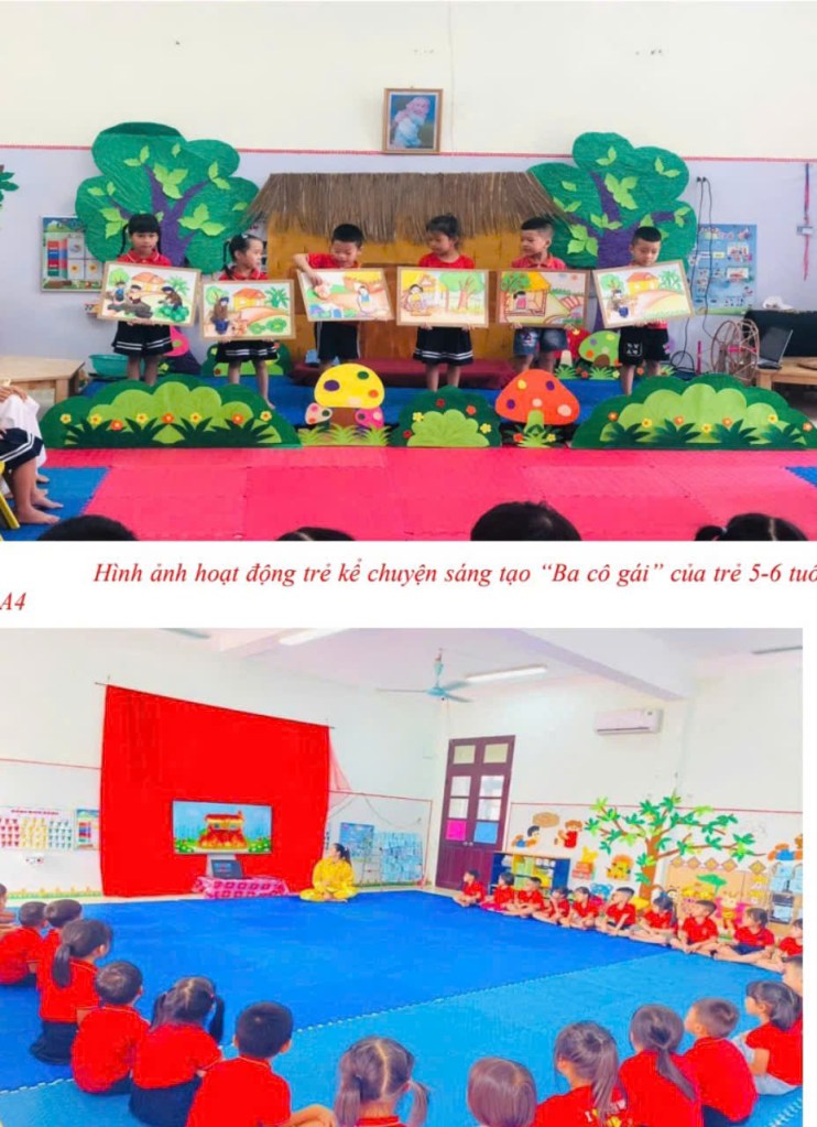 Hay hoạt động kể chuyện sáng tạo “Ba cô gái” của cô giáo Ngô Thị BíchCô Bích đã không chỉ kể một câu chuyện đơn thuần mà còn tạo điều kiện để trẻ tham gia vào việc diễn xuất và sáng tạo các tình huống trong câu chuyện. Bằng cách này, trẻ không chỉ phát triển khả năng ngôn ngữ mà còn rèn luyện kỹ năng giao tiếp và tự tin thể hiện bản thân. Sự tham gia của trẻ vào các tình tiết của câu chuyện khiến cho hoạt động trở nên sinh động và hấp dẫn.
