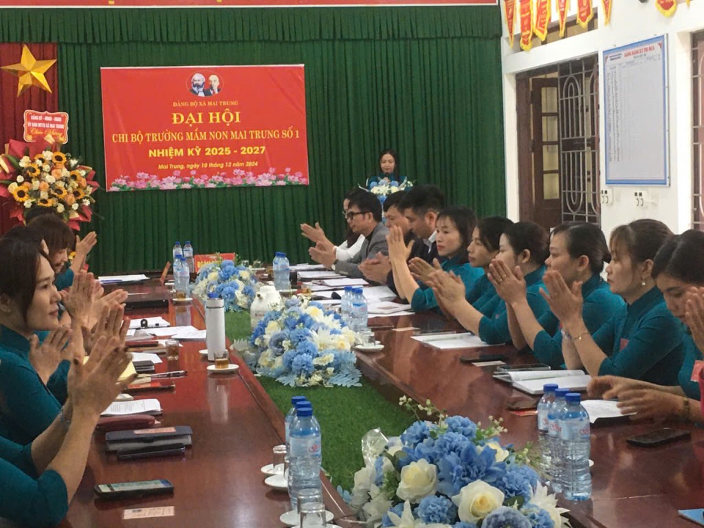 Đại hội đã tiến hành bầu Chi ủy, Bí thư, phó bí thư nhiệm kỳ 2025-2027. Đồng chí Nguyễn Thị Hợp được Đại hội tín nhiệm bầu làm Bí thư chi bộ. Đồng chí Triệu Thị Phương Đua phó bí thư chi bộ, đồng chí Nguyễn Thị Hòa là Chi ủy viên; Đại hội bầu 04 đồng chí đại biểu chính thức và 01 đại biểu dự khuyết vào đoàn đại biểu đi dự Đại hội Đảng bộ xã MaiTrung khóa XXVI, nhiệm kỳ 2025-2030. Với tinh thần làm việc khẩn trương, nghiêm túc và trách nhiệm, Đại hội Chi bộ trường Mầm non Mai Trung số 1 nhiệm kỳ 2025 – 2027 đã thành công tốt đẹp. Tập thể Chi bộ trường mầm non Mai Trung số 1 quyết tâm tổ chức thực hiện đạt hiệu quả tốt các mục tiêu, phương hướng trong nhiệm kỳ tới.