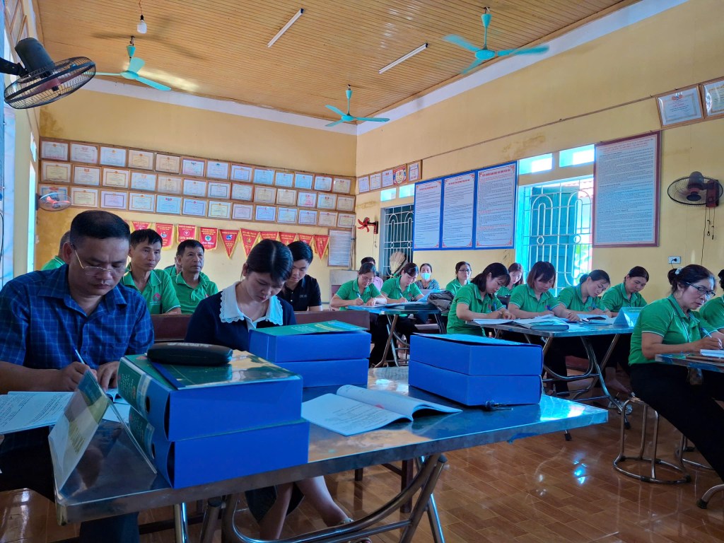 Nhân viên Phòng giao dịch NHCSXH Hiệp Hòa triển khai hoạt động tín dụng chính sách trên địa bàn xã Hoàng Vân