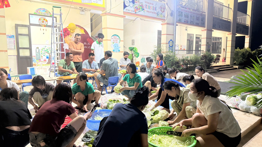 Bên cạnh đó, các bậc phụ huynh của trường cũng đồng lòng nhiệt tình góp công, góp sức cùng với CBGV, NV nhà trường kịp thời nấu xong những xuất cơm thấm đậm nghĩa tình gửi tới các cán bộ chiến sĩ bộ đội trước 5h sáng để các chú kịp thời giúp nhân dân xã Hợp Thịnh ứng phó với tình hình lũ trên sông.