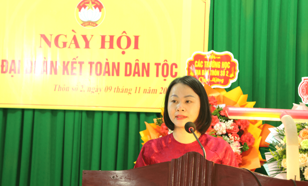Phát biểu tại Ngày hội, đồng chí Chu Thị Phượng, Phó Chủ tịch UBMTTQ, Chủ tịch Hội Nông dân xã bày tỏ vui mừng khi thấy Chi bộ, ban lãnh đạo và Ban Công tác Mặt trận thôn số 2 đã tích cực tuyên truyền, vận động Nhân dân thực hiện tốt các phong trào thi đua, các cuộc vận động ở địa phương, đóng góp có hiệu quả vào việc xây dựng nông thôn mới, đô thị văn minh, bảo đảm an sinh xã hội, nâng cao đời sống vật chất, tinh thần cho nhân dân.