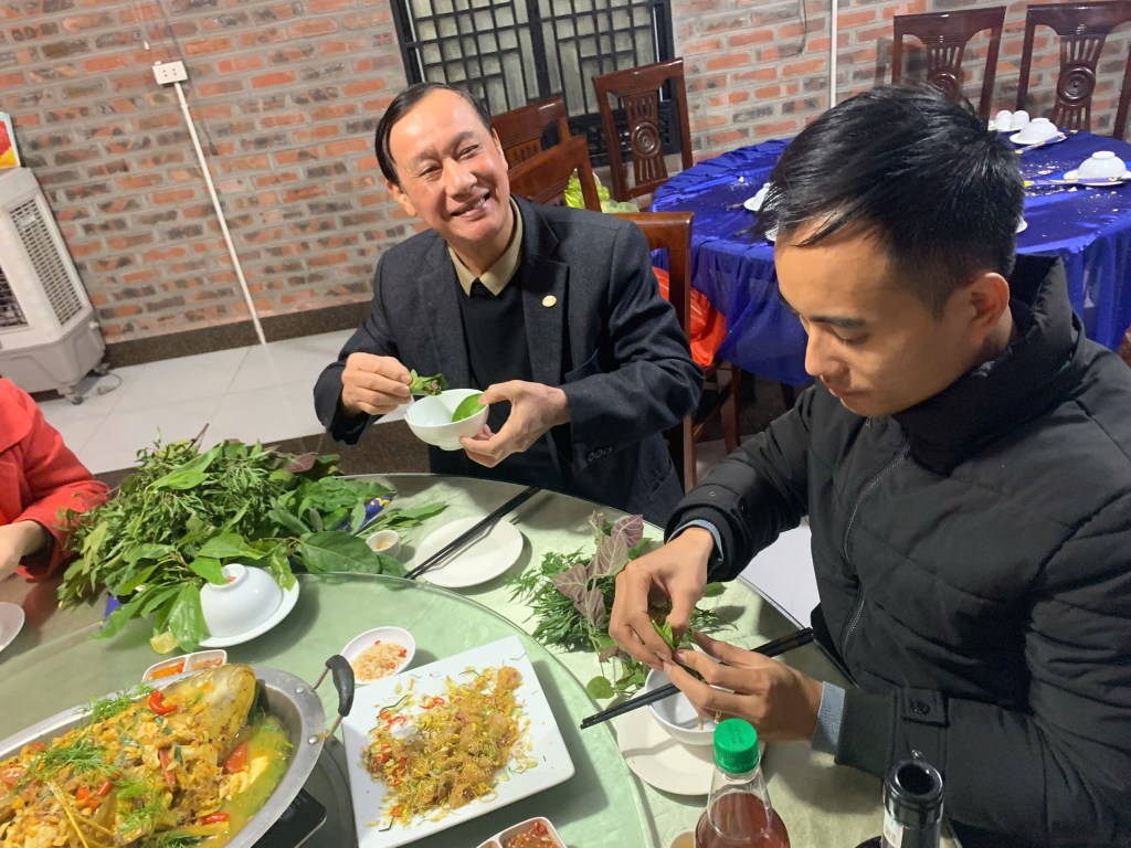 Khi mâm gỏi được bày lên, trung tâm là cá , là hạt là những đĩa gia vị ăn kèm . Xung quanh bày kín là sáu bảy loại lá thơm xanh mát. Thực khách chỉ việc rót rượu ra – thứ rượu men bắc thơm lừng hương vị đồng quê càng tốt rồi lấy vài chiếc lá thơm cuốn lại như chiếc phễu nhỏ xinh , bỏ vào đó ít khế, hành tím, chuối xanh, tỏi ta , một ít cá rồi xúc hạt phủ lên trên. Xong thì nhẹ nhàng đưa vào miệng, từ từ … Thật từ từ ăn để cảm nhận mọi hương vị thơm ngon tuyệt vời của món gỏi cá trứ danh này ! Xong rồi, để tiễn cái vị ngon, ngọt bùi của cá của rau, vị cay cay nồng nồng của tỏi của tiêu, của giềng và ớt, vị chát của chuối, vị chua của khế thì hãy nhấp thêm ngụm rượu kia vào !!! Chao ôi, sao mà phê pha , sao mà ngon đến thế ! Gỏi cá quê tôi là thế đấy. Gỏi cá nhà hàng Thuận Phát là thế đấy.