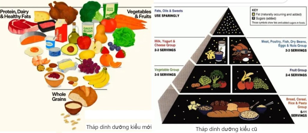 - Thay đổi cốt lõi: đảo ngược tháp dinh dưỡng truyền thống. Chuyển trọng tâm từ tinh bột (carbohydrate) sang protein (đạm) và thực phẩm nguyên bản (“real food”).