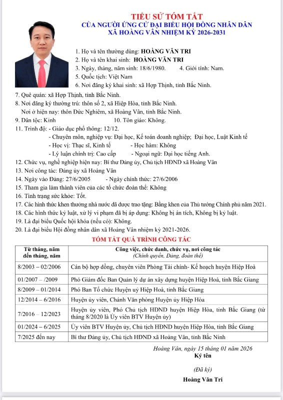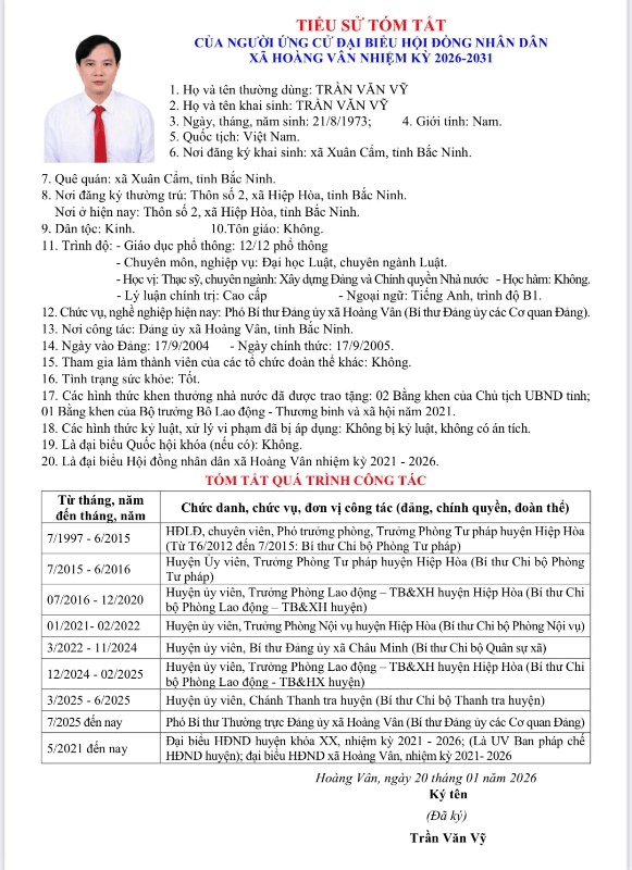 1. Đồng chí Hoàng Văn Tri, Bí thư Đảng ủy, Chủ tịch HĐND xã Hoàng Vân tham gia ứng cử đại biểu HĐND xã khóa XXI, nhiệm kỳ 2026- 2031 tại đơn vị bầu cử số 2, gồm 6 thôn của xã Thanh Vân cũ: Thôn Thanh Phác, Thôn Thanh Bình, Thôn Thanh Lay, Thôn Thanh Vòng, Thôn Đồng Điểm, Thôn Hoàng Lại.