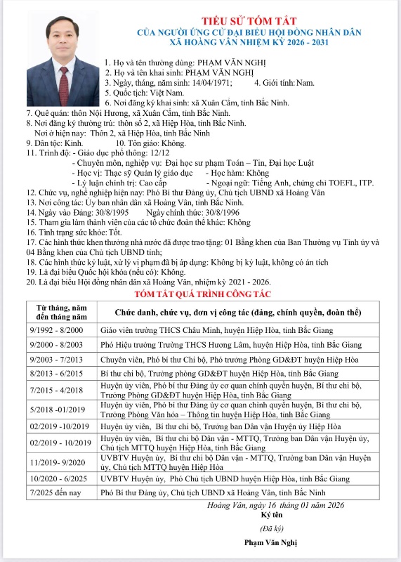 3. Đồng chí Phạm Văn Nghị, Phó Bí thư Đảng ủy, Chủ tịch UBND xã Hoàng Vân tham gia ứng cử đại biểu HĐND xã, khóa XXI, nhiệm kỳ 2026- 2031 tại đơn vị bầu cử số 5, gồm 6 thôn của xã Hoàng Lương cũ: Thôn Thanh Lâm, Thôn Ninh Sơn, Thôn Hoàng Giang, Thôn Tân Định, Thôn Thanh Lương, Thôn Đại Thắng.